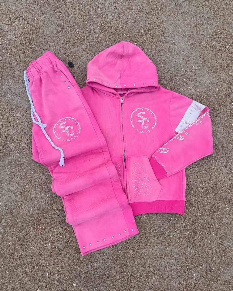Pantalones de chándal acampanados con diamantes de imitación para hombre de punto de gofres de peso pesado y conjuntos de Sudadera con capucha personalizados 2 piezas Streetwear chándal Jogger Sweatsuit