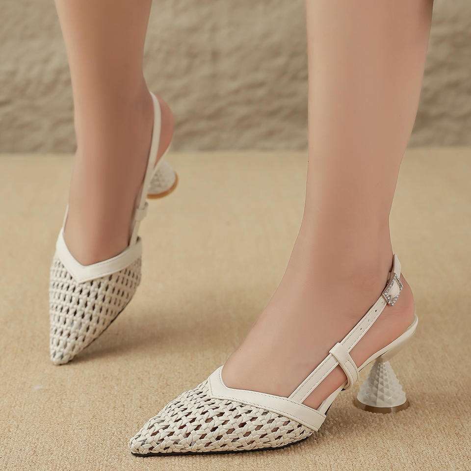 Sandalias de tacón medio con punta, diseño hueco, correa tejida, de una sola tira, punta cerrada, para mujer, en negro y blanco, para las cuatro estaciones.