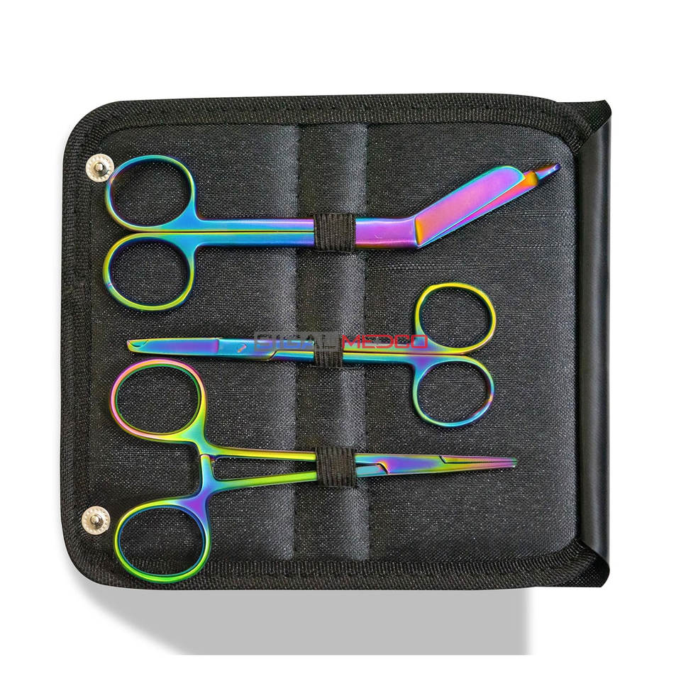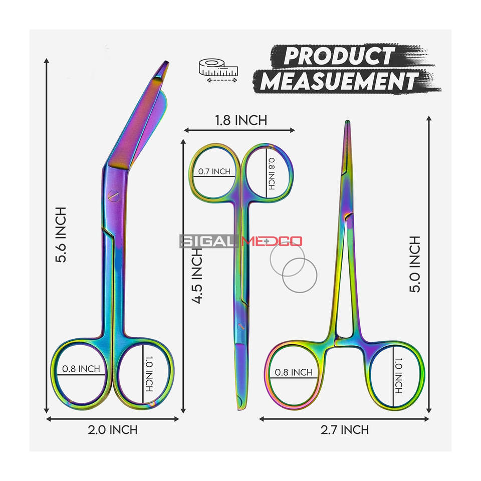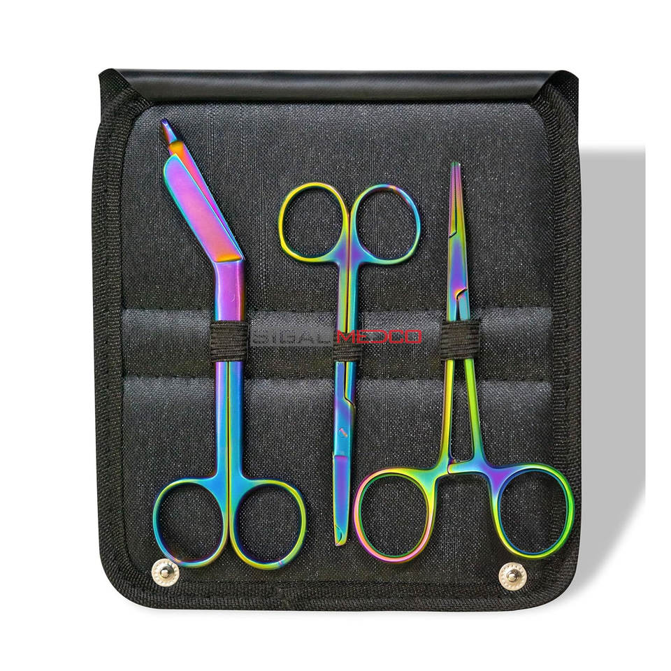 Juego de Tijeras Hemostáticas de 3 Piezas, Multicolor, Recubiertas de Titanio, Tijeras para Suturas de Primera Calidad, Tijeras para Vendajes Lister Arcoíris, Manuales, CE