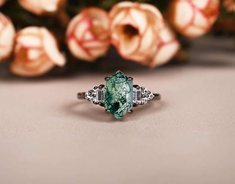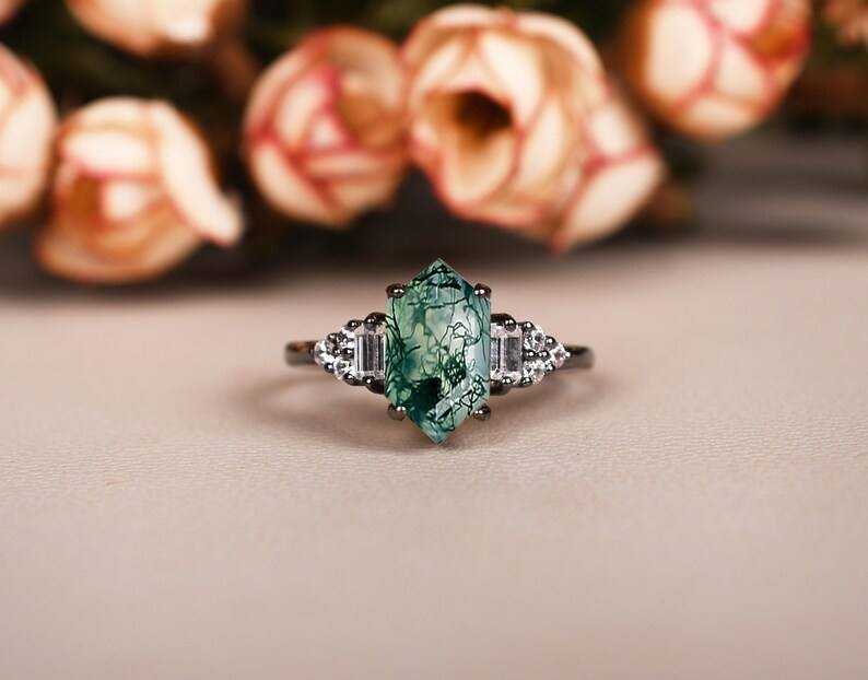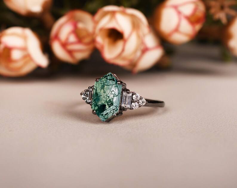 Anillo de Compromiso de Plata de Ley con Ágata Musgosa Hexagonal y Rodio Negro, Diseño Único para Ella, Regalo de Aniversario