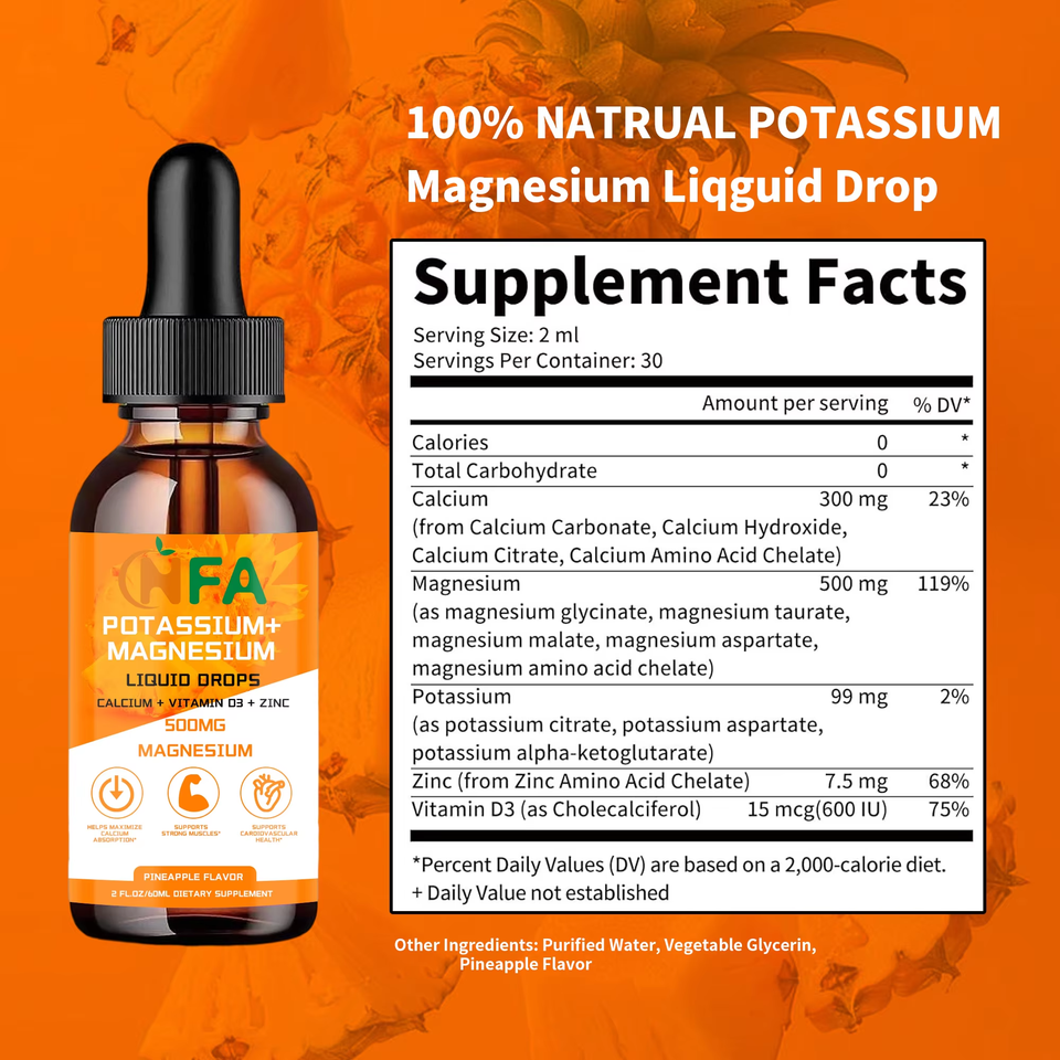 Gotas líquidas de magnesio y potasio de alta absorción 500mg con calcio Vitamina D3 Soporte de zinc Gotas musculares fuertes
