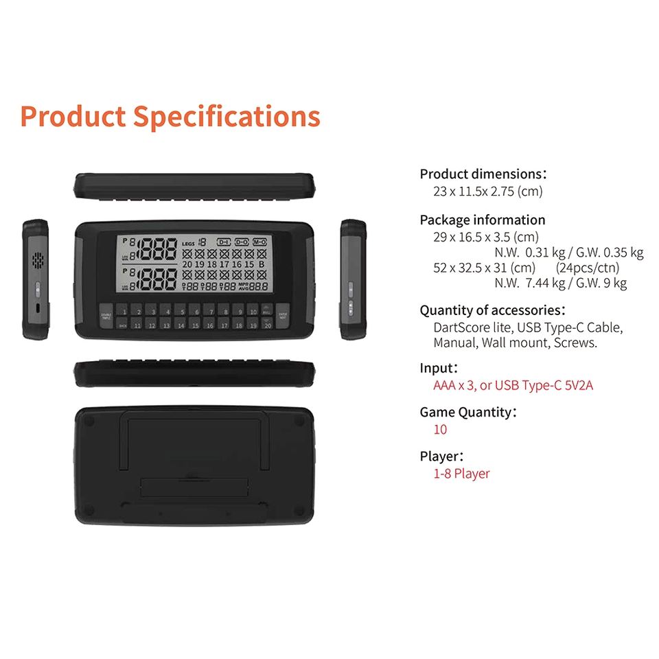 Accesorios Incluidos:DartScore lite, Cable USB Tipo-C, Manual, Soporte de pared, Tornillos