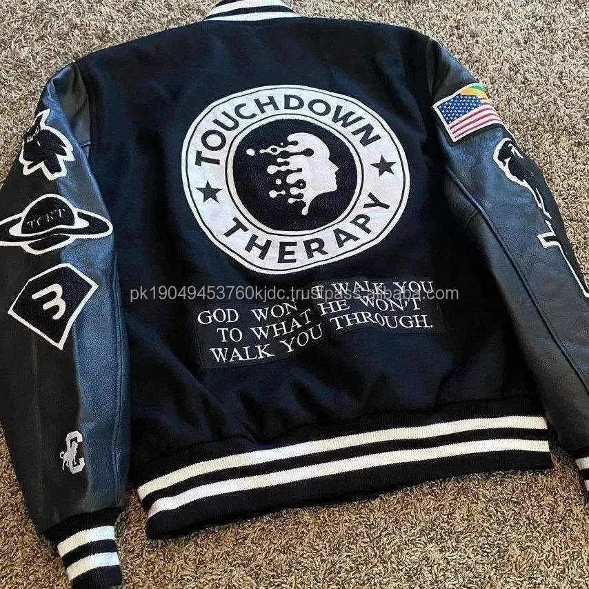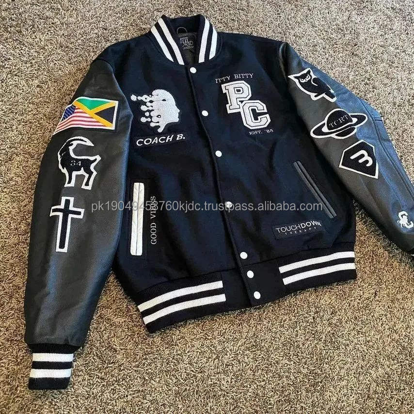 Chaqueta universitaria de alta demanda Chaqueta universitaria de lana unisex con botones abiertos con estilo con mangas de cuero Chaqueta con letras personalizadas de calidad