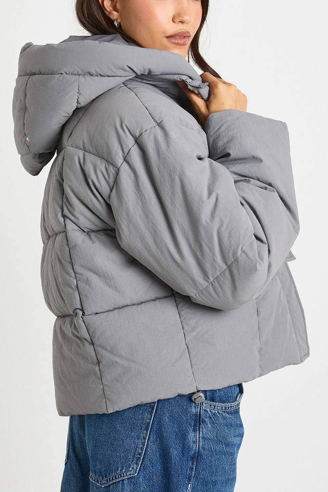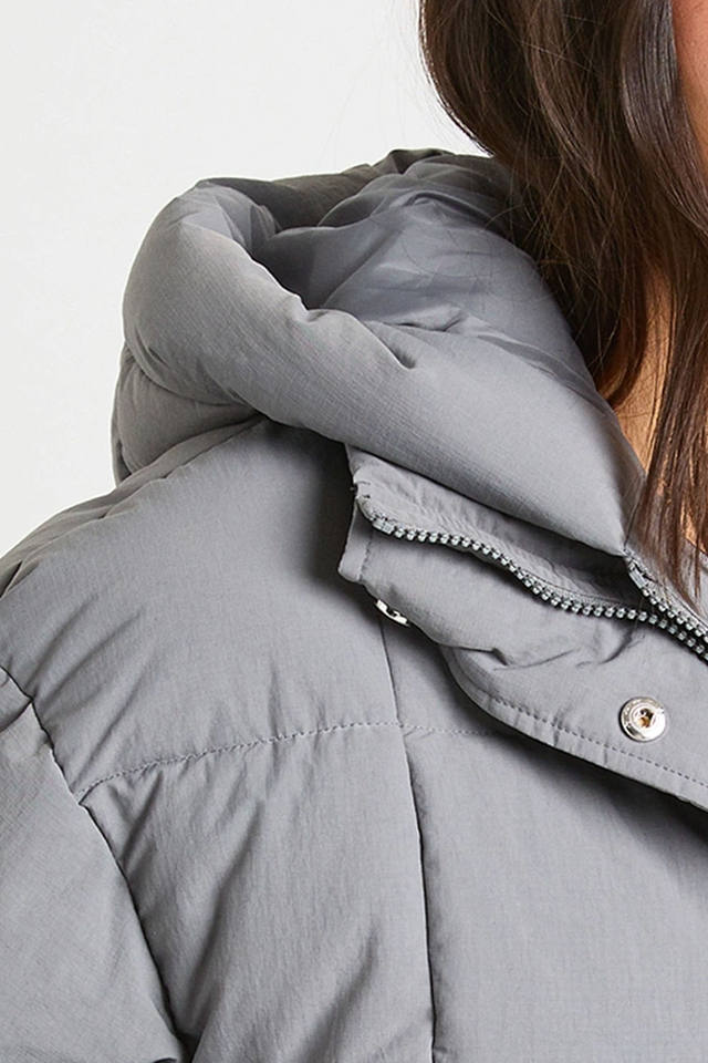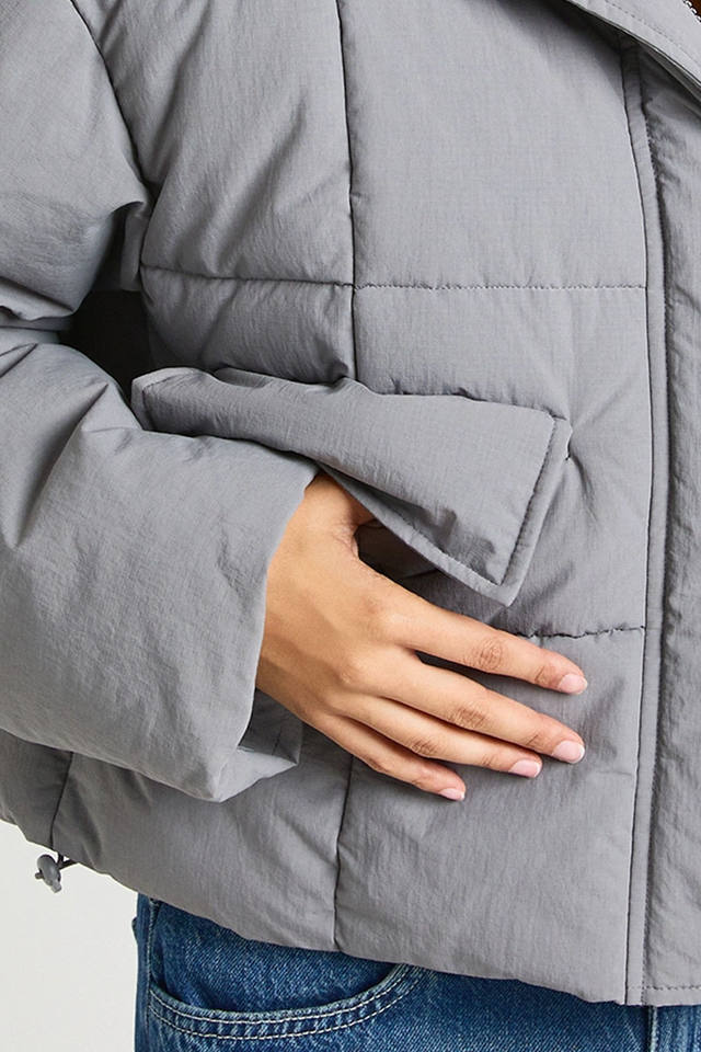 Chaqueta acolchada con textura y capucha gris con logotipo personalizado de alta demanda para mujer, cortavientos, ropa de calle cálida para invierno, chaqueta acolchada para mujer