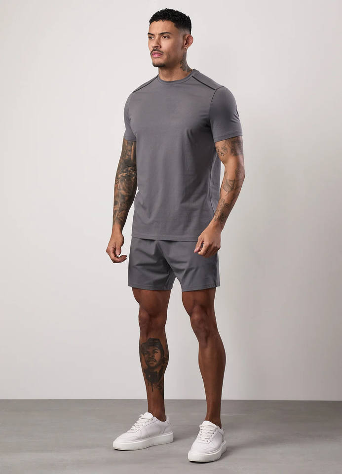 Diseño personalizado de alta exigencia Logo gris 2 piezas Muscle Fit hombres Jersey camiseta y pantalones cortos conjunto gimnasio entrenamiento playa y ropa de calle