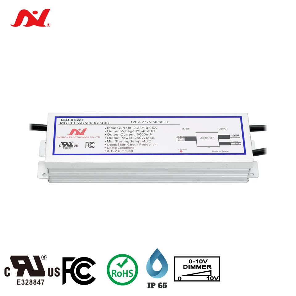 Controlador LED de salida única de alta eficiencia 240W con diseño impermeable y atenuación de 0-10V para iluminación LED