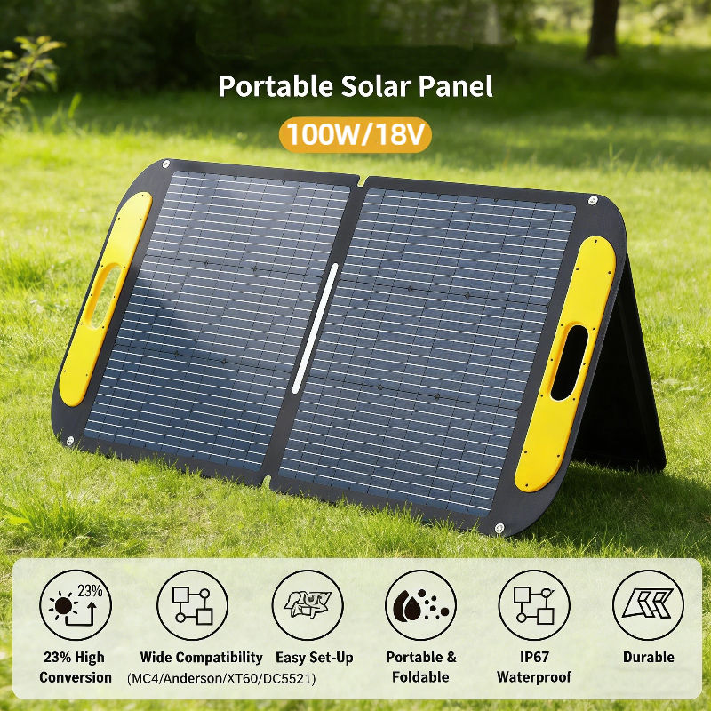 Panel Solar Portátil Plegable Negro de 100W 19V de Alta Eficiencia y Resistente a la Intemperie (23% de Conversión) con Soportes Ajustables