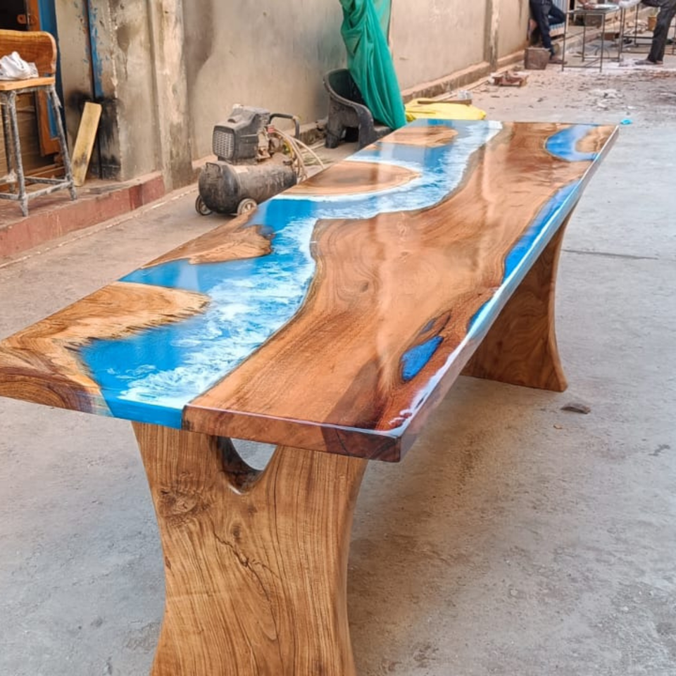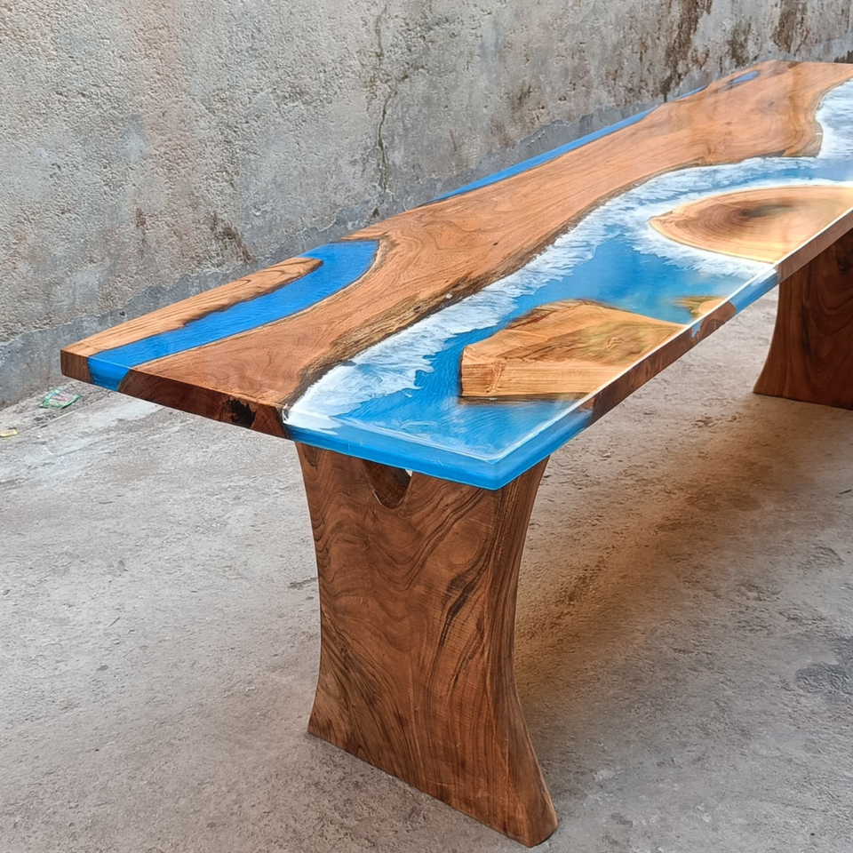 Mesa de comedor de borde vivo de madera de Acacia de gama alta, diseño de Isla de resina epoxi azul océano, muebles de comedor modernos duraderos de 8 plazas