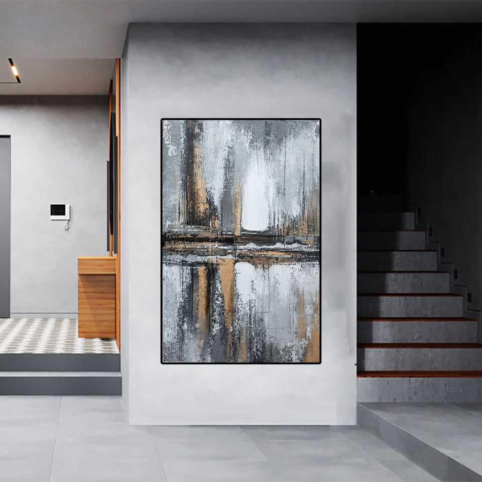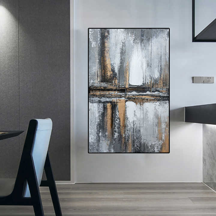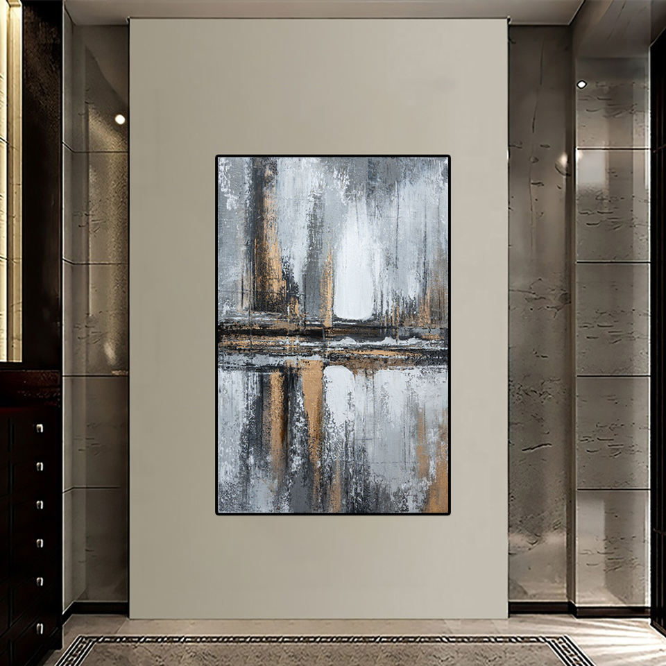 Pintura al óleo pintada a mano abstracta negra gris de gama alta con luz de lámina dorada Sala de estar de lujo Sof para arte de pared de pasillo de entrada