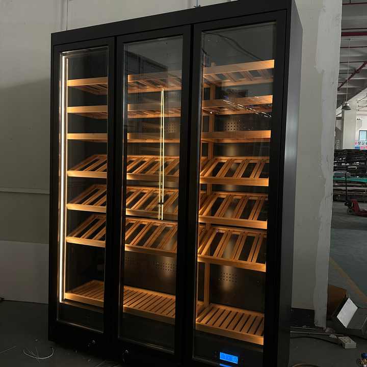 Enfriador de vino y bebidas con puerta de vidrio de doble capa personalizado de gama alta con control climático con elegante gabinete de bodega