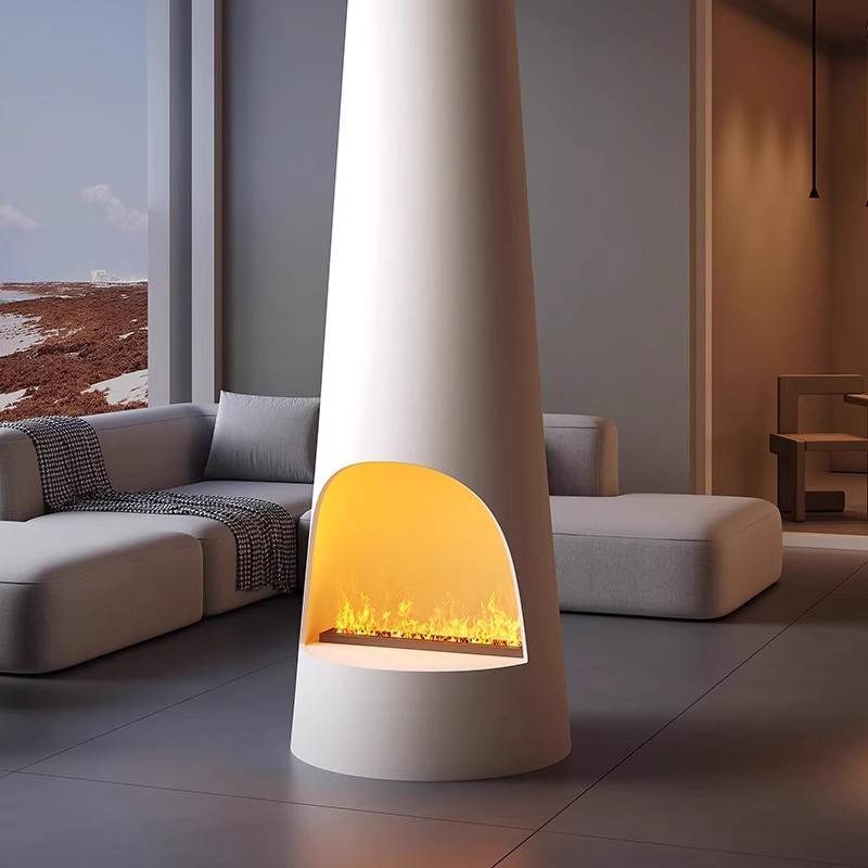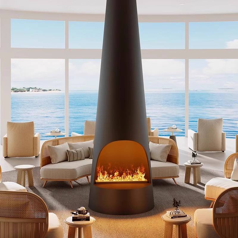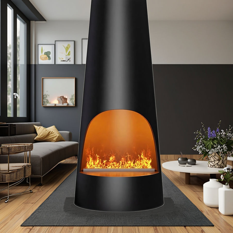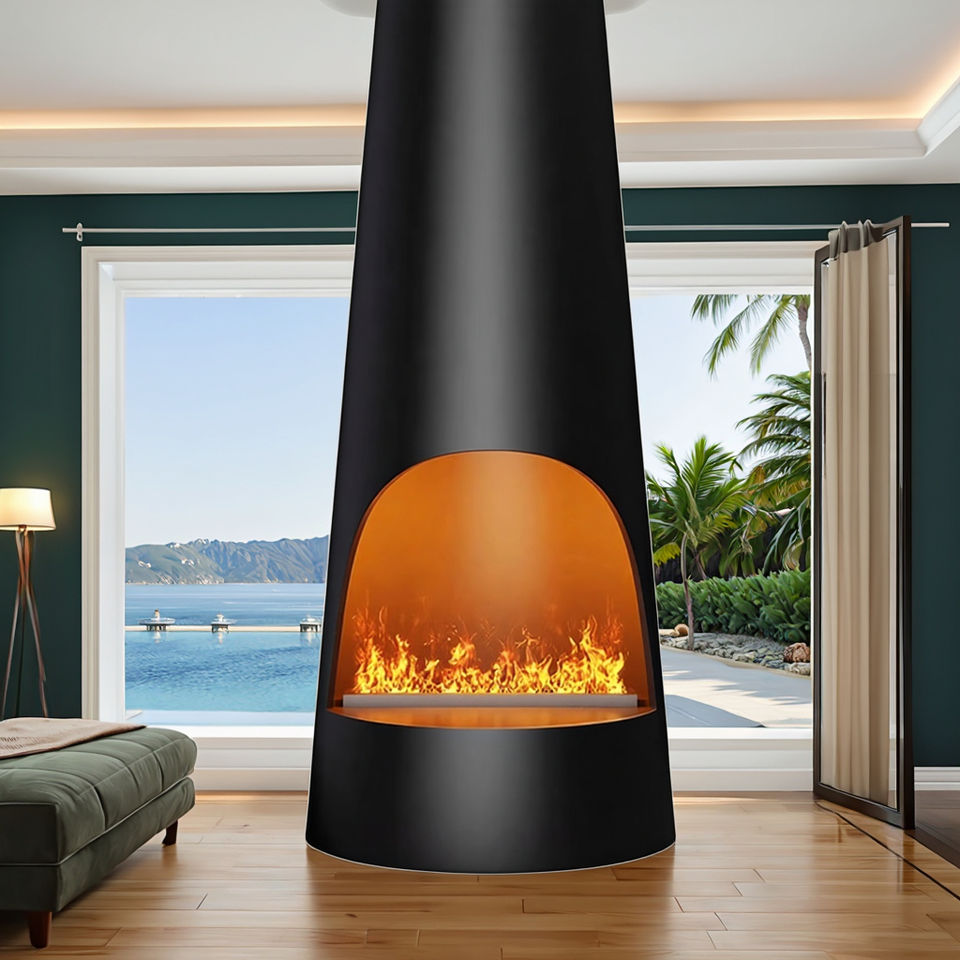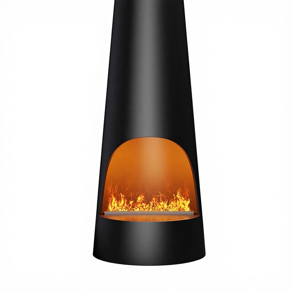 Chimenea Decorativa Artística de Diseño Contemporáneo de Acero al Carbono de Alta Gama, Cilíndrica Suspendida, con Atomización 3D Simulada de Fuego
