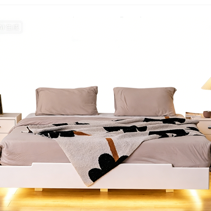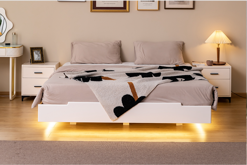 Cama Suspendida de Madera Maciza de Alta Gama Personalizada con Lámpara de Inducción de Lujo para Dormitorio Principal - Diseño Crema - 1.2-1.8 Metros