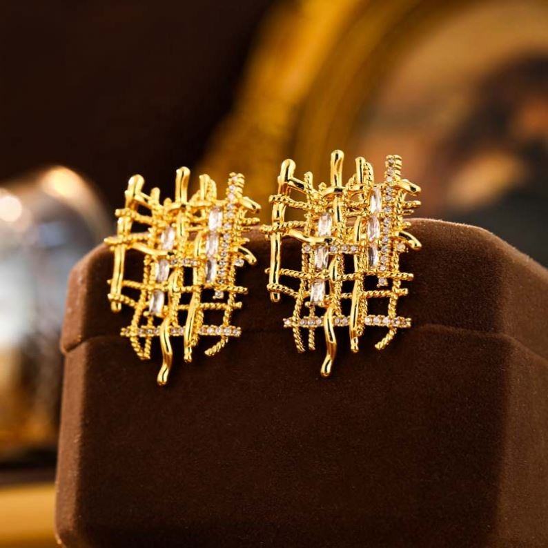 Pendientes de Botón de Metal Tejido Chapados en Oro con Microincrustaciones de Circonita Geométrica de Estilo Europeo Americano de Alta Gama para Mujer, Regalo de Moda
