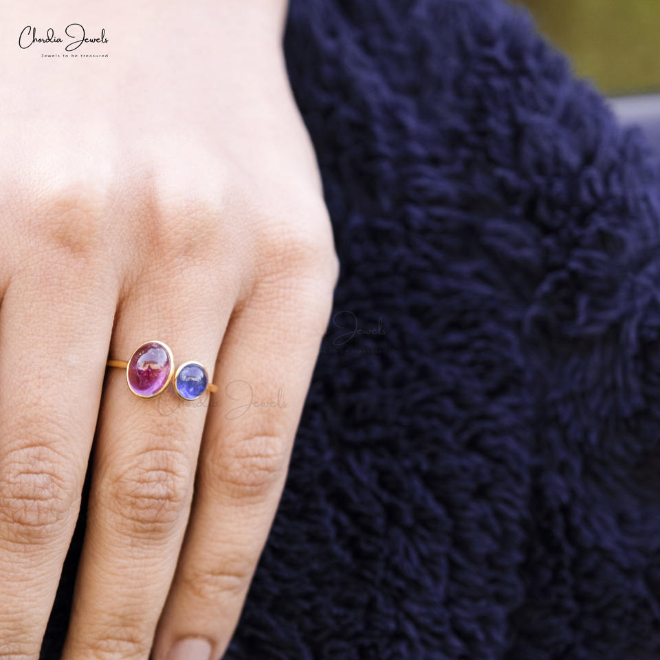 Joyería de gama alta Anillo de puño abierto de tanzanita genuina en juego de alambre de oro amarillo de 14K 10x8mm Anillo de boda de turmalina Rosa cabujón ovalado