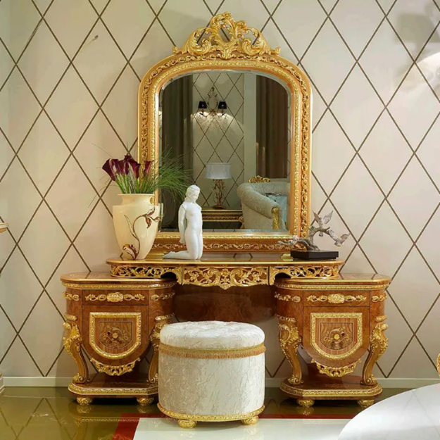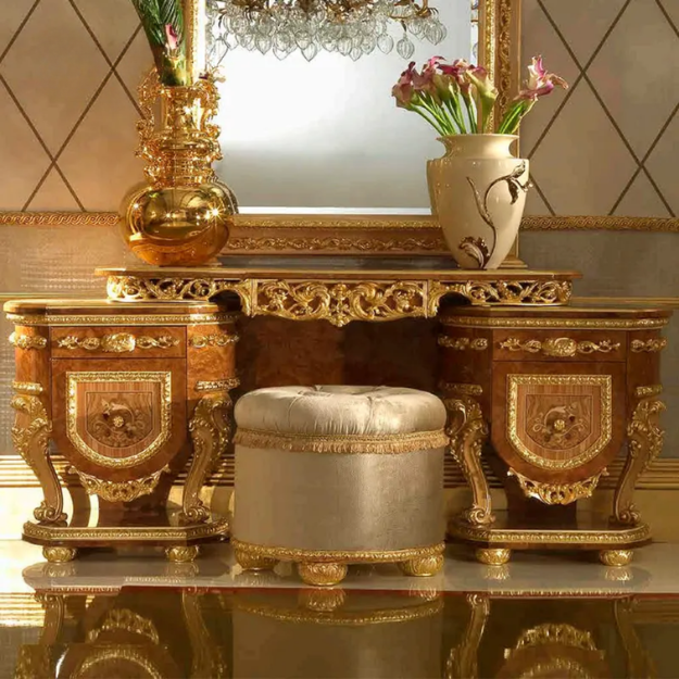 Tocador de Lujo de Alta Gama con Espejo, Madera de Nogal y Caoba Sólida, Detalles Dorados, Diseño Clásico para Dormitorio