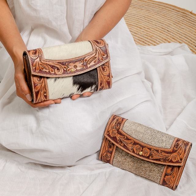Carteras de mano de cuero de vaca genuina hechas a mano de alta calidad hechas a mano con función antirrobo de tallado en tendencia