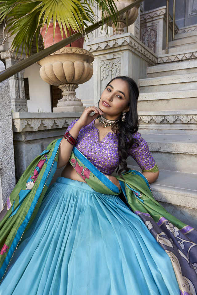 Trabajo Lehenga:Kalamkari con trabajo de lámina