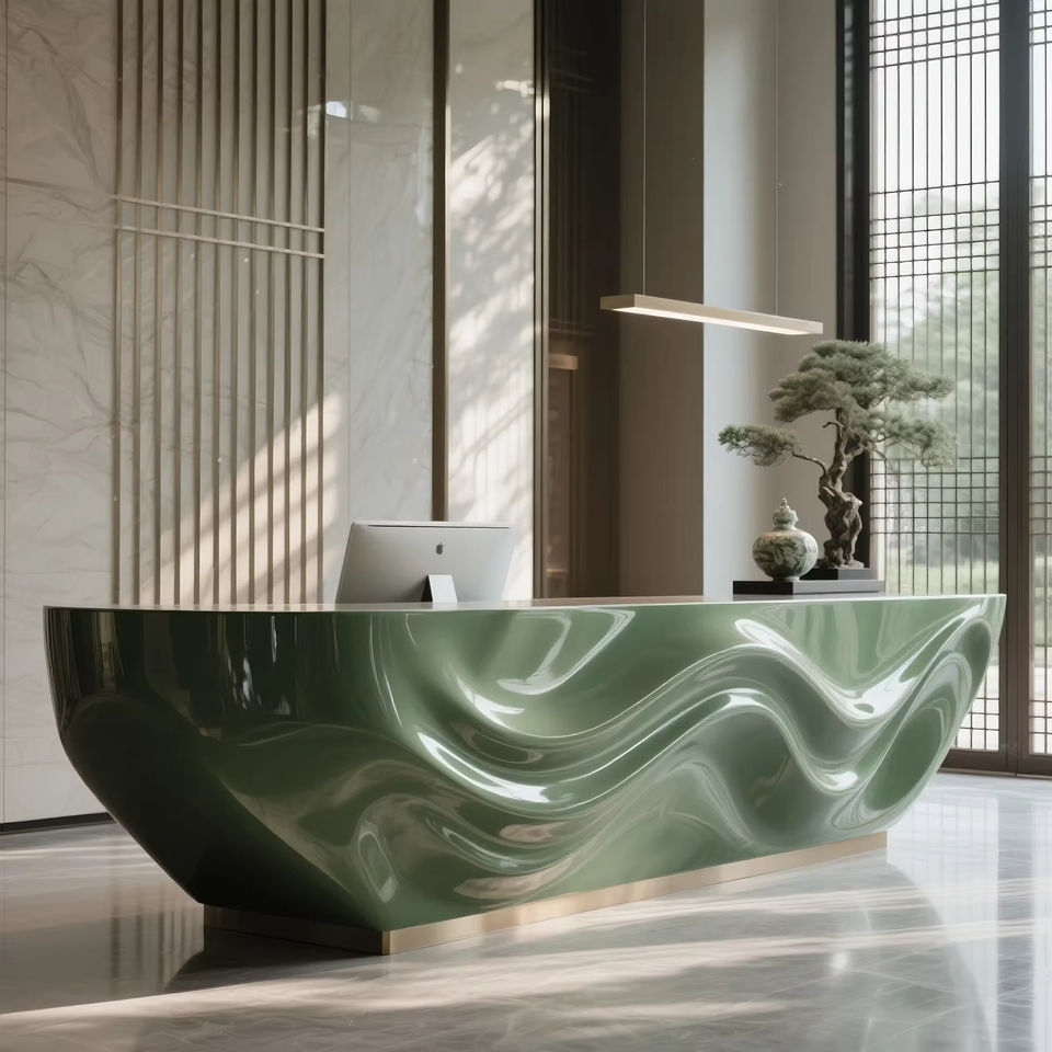 Mostrador de Recepción Blanco de Alta Gama con Diseño Contemporáneo en Forma de Ola, Perfecto para Vestíbulos de Oficinas y Entradas Corporativas