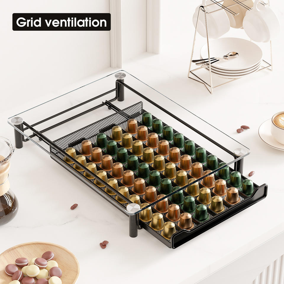 Estante de almacenamiento de cápsulas Nespresso de vidrio de alta calidad, caja de soporte de almacenamiento de cápsulas de café estilo cajón de acero al carbono