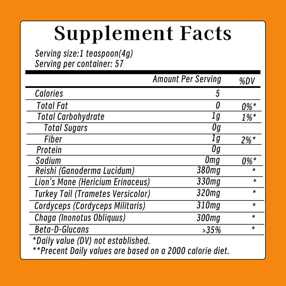 Reishi, Mane de León, Cola de Turquía, Cordyceps, Chaga, Beta-D-GlucanosIngrediente principal