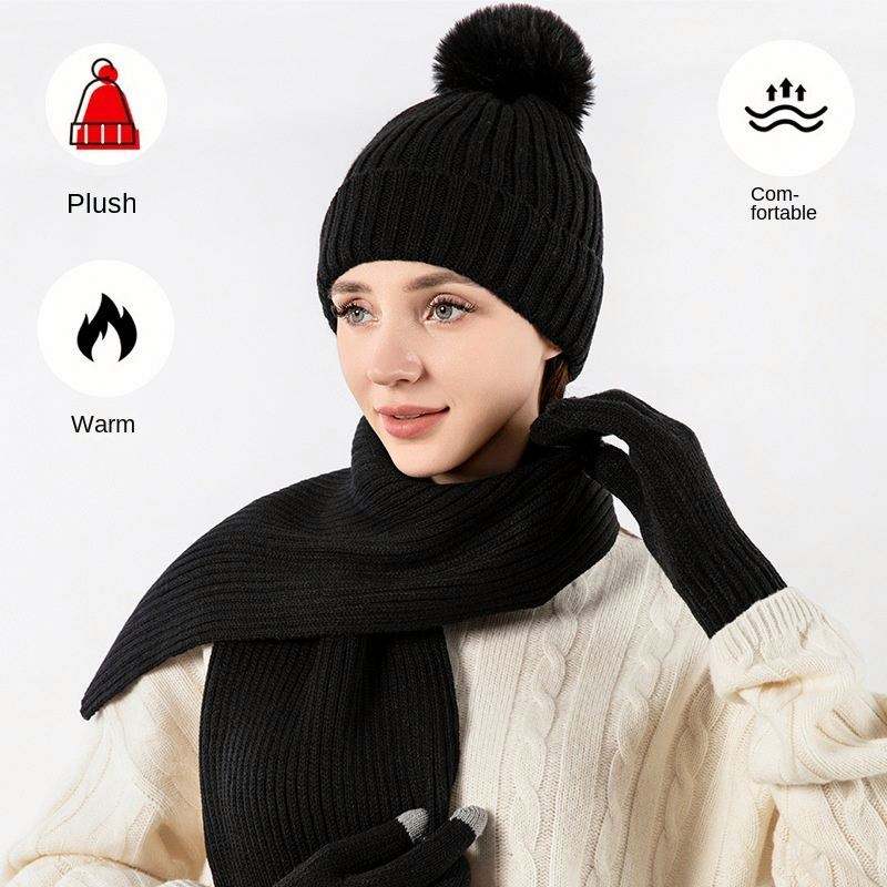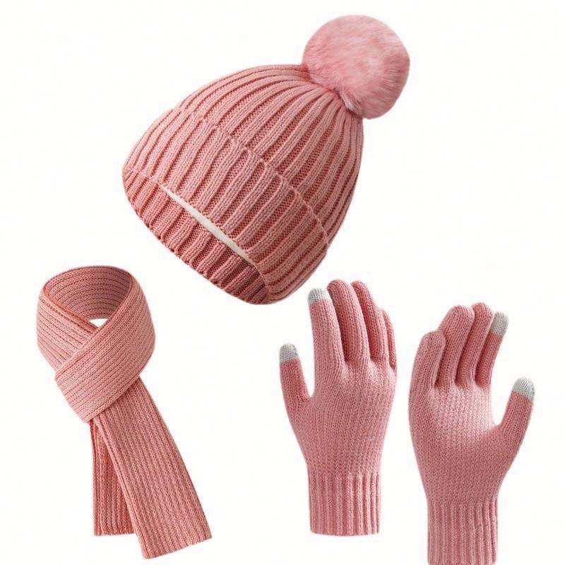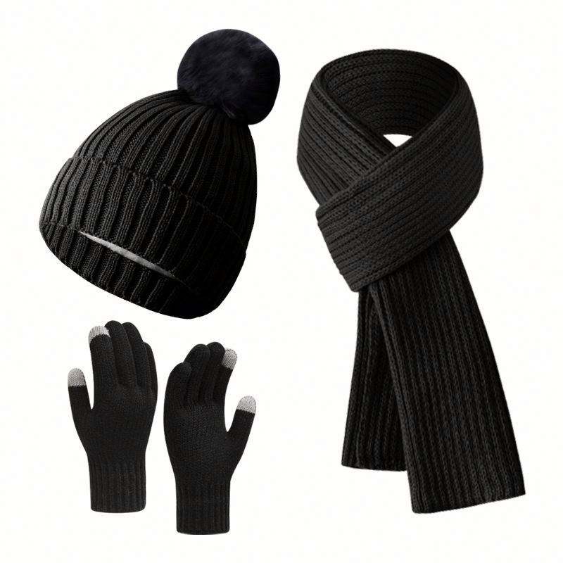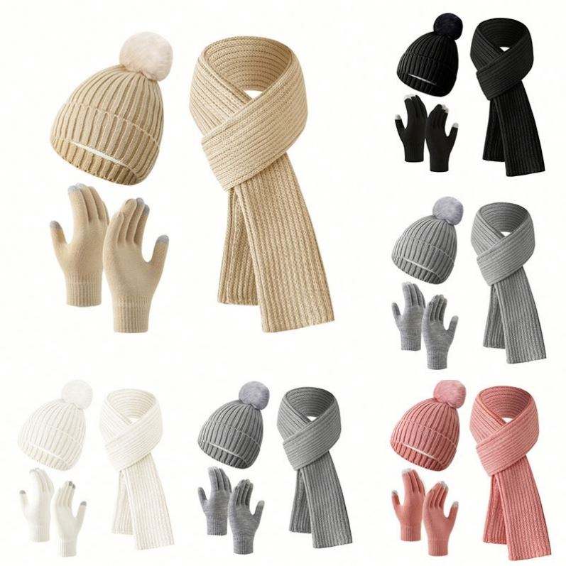 Conjunto de Tres Piezas de Gorro y Guantes de Lana de Invierno de Alta Calidad, Color Sólido, Tejido a Mano, Personalizado para Mujer