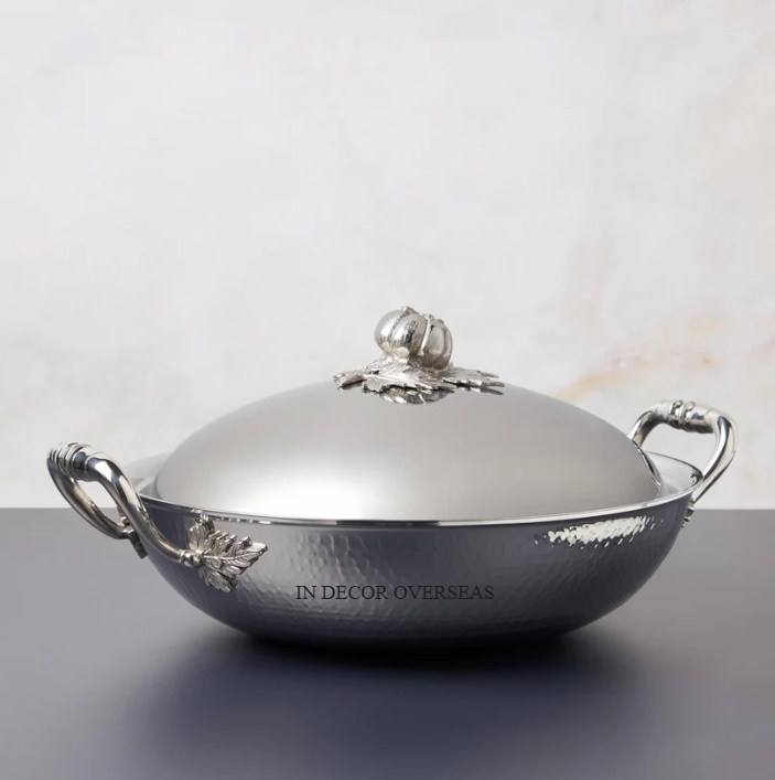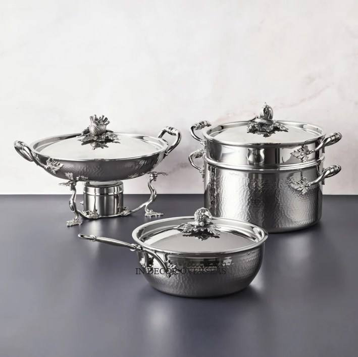 Alta demanda Acero inoxidable Plata Brillante Pulido Textura martillada Utensilios de cocina Cacerola Ruffoni con tapa superior de verduras