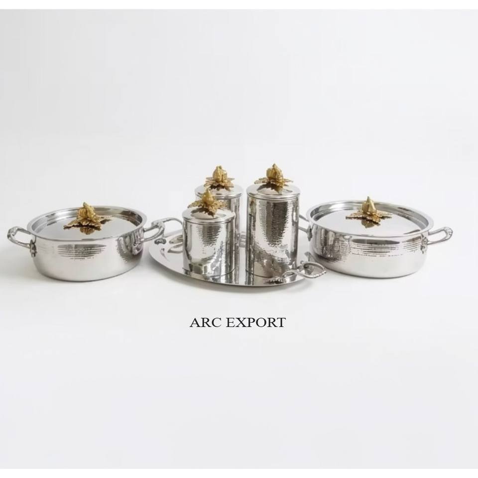 Ollas y cacerolas Ruffoni de acero inoxidable pulido plateado con textura martillada, de alta demanda, con juego de recipientes, de la India.
