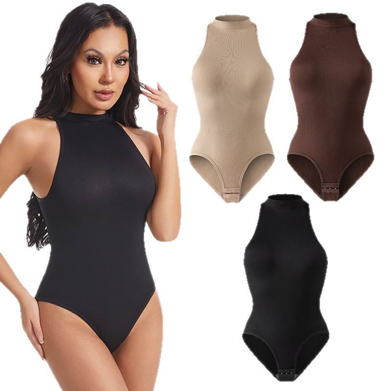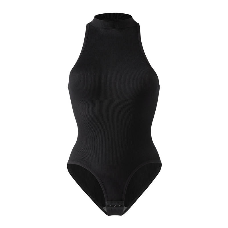 Body de yoga de punto acanalado con cuello alto para mujer, sin mangas, espalda cruzada, ajuste ceñido, prenda básica moldeadora para uso diario
