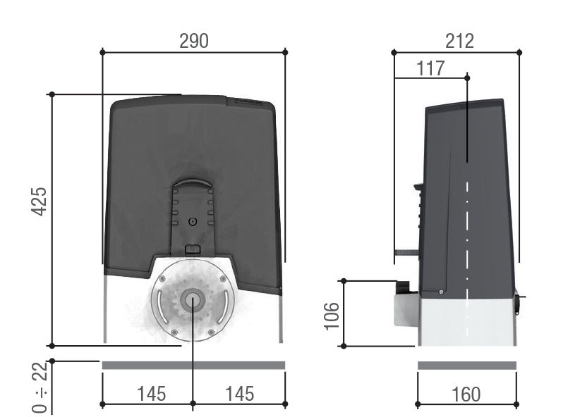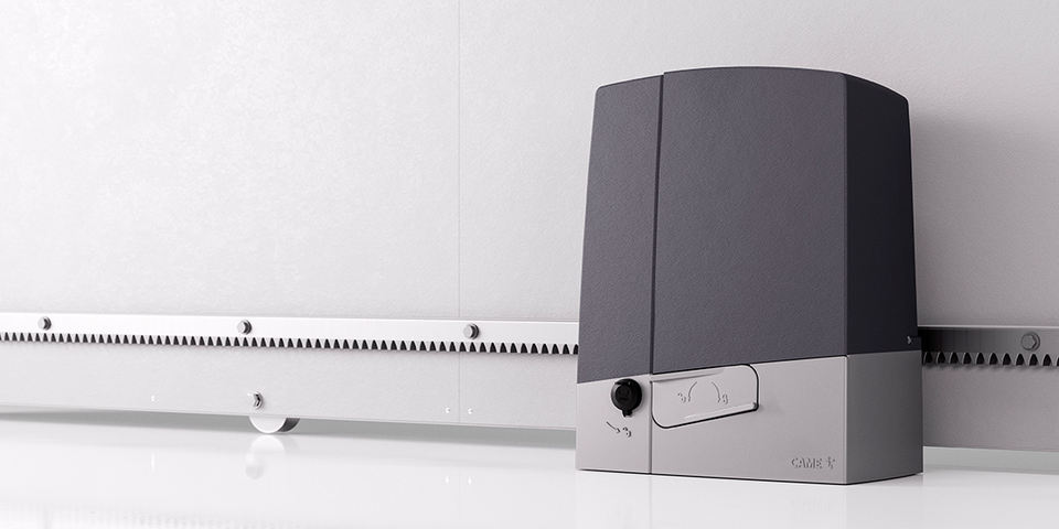 Operador con el motor 24 V, Con un tablero de control con pantalla, Decodificación de radio a bordo, Movimiento y obstrucción que detectan el dispositivo, Para puertas correderas de hasta 1.000 kg de peso, Hasta 20 m de largo. Cubierta RAL7024-greyProyecto de solución de capacidad