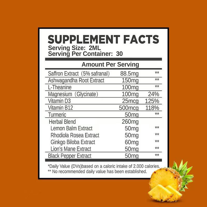 Ingrediente principal:Extracto de Azafrán, Extracto de Raíz de Ashwagandha, L-Teanina, Magnesio, Vitamina D3, Vitamina B12, Cúrcuma, Extracto de Pimienta Negra, Mezcla de Hierbas