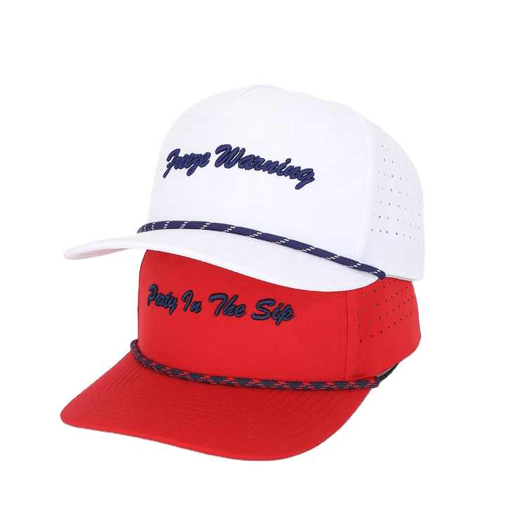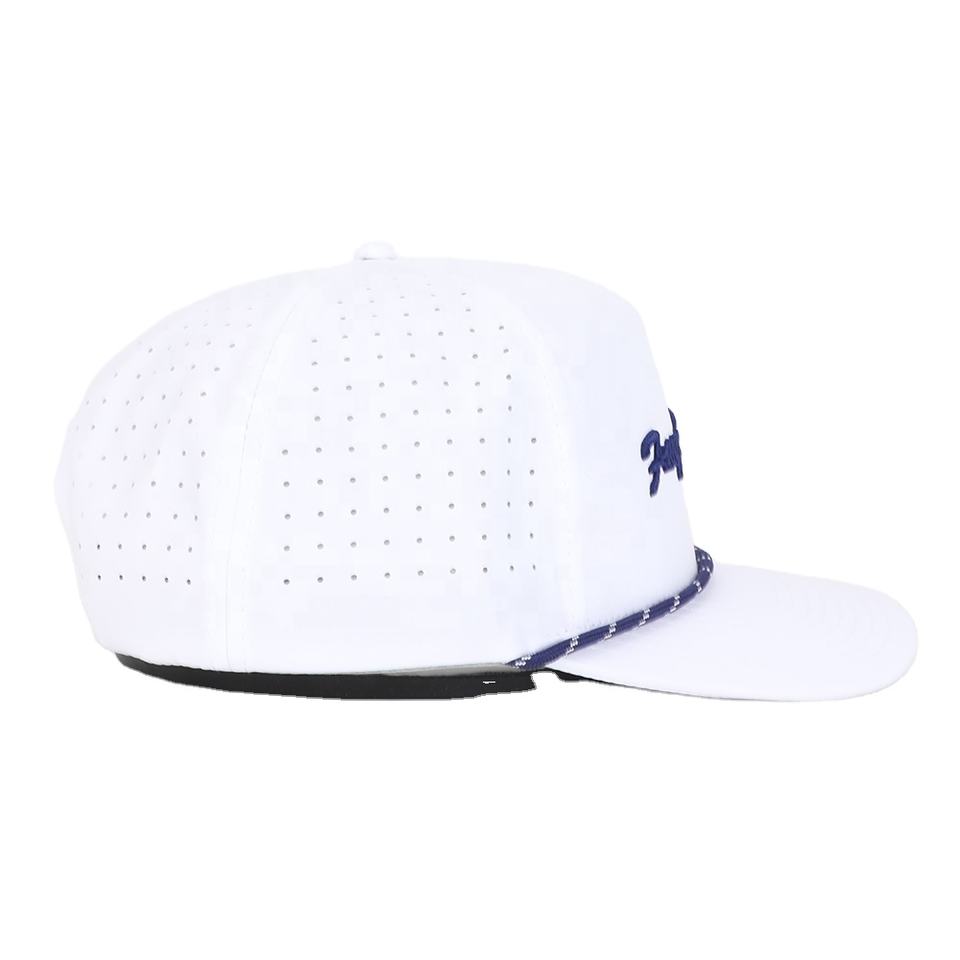 Alta calidad 100% algodón 5 paneles poliéster impermeable deporte camionero sombrero personalizado corte láser agujero OEM bordado logotipo al por mayor