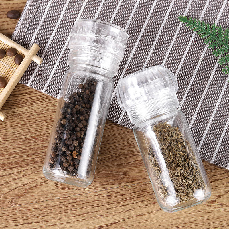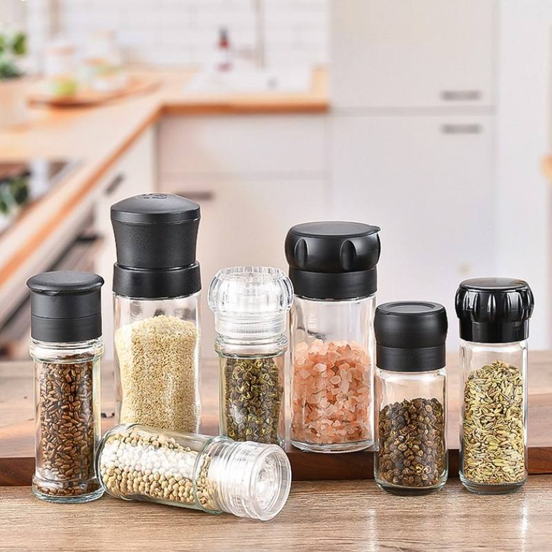 Mini botella de condimento de cocina de vidrio de alta calidad de 100ml, 110ml, 200ml, con cabezal de molinillo ajustable Manual para pimienta, sal de anís