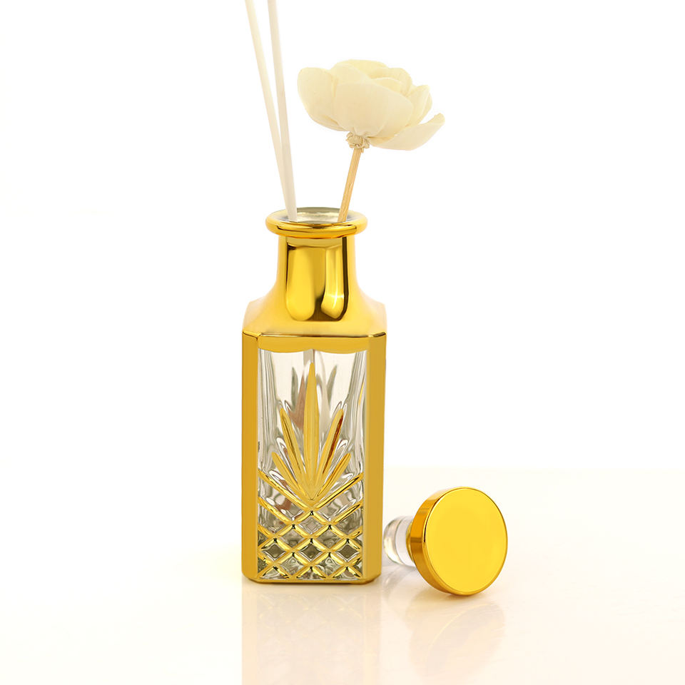 Alta calidad 150ml Manual ultravioleta chapado en oro pantalla vidrio Perfume engrasador reciclable forma cuadrada con hermosa decoración