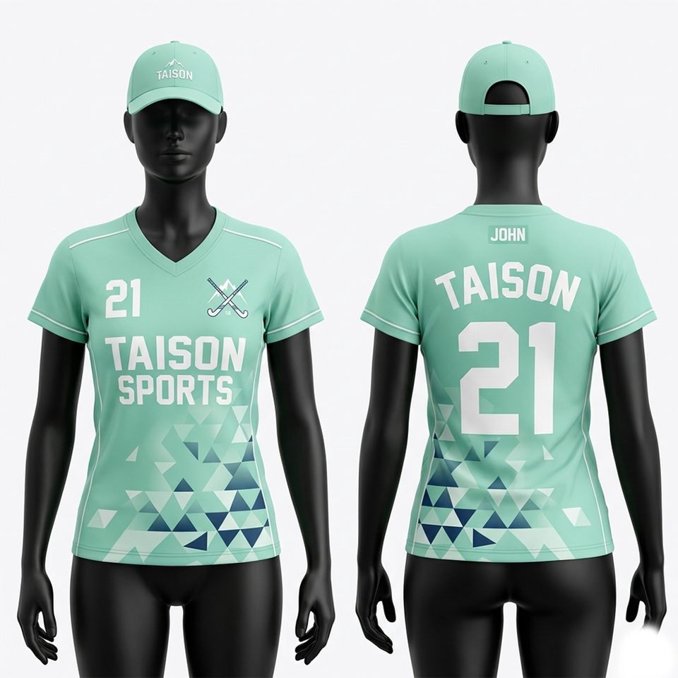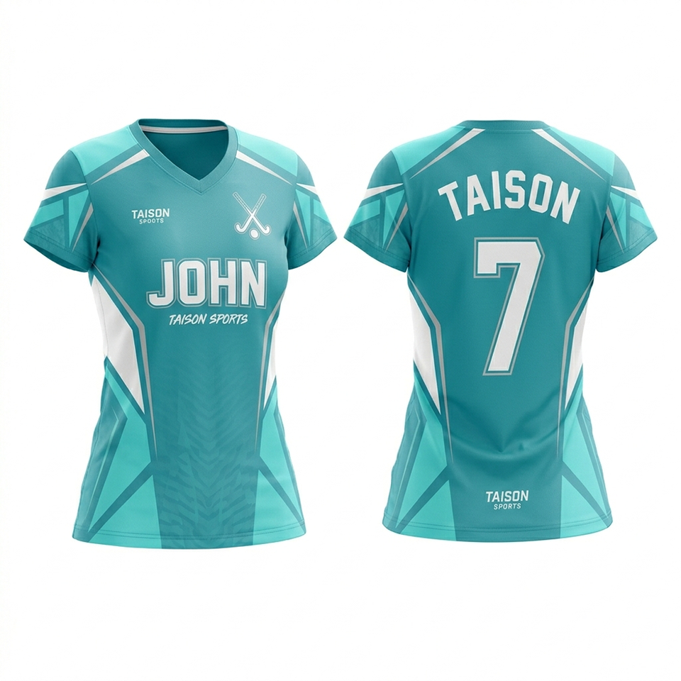 Camiseta de Hockey sobre Césped para Mujer de Alta Calidad, 180 GSM, Malla de Poliéster, Color Verde Azulado con Paneles Blancos en Contraste, Absorbe la Humedad, Logotipo Sublimado Personalizado