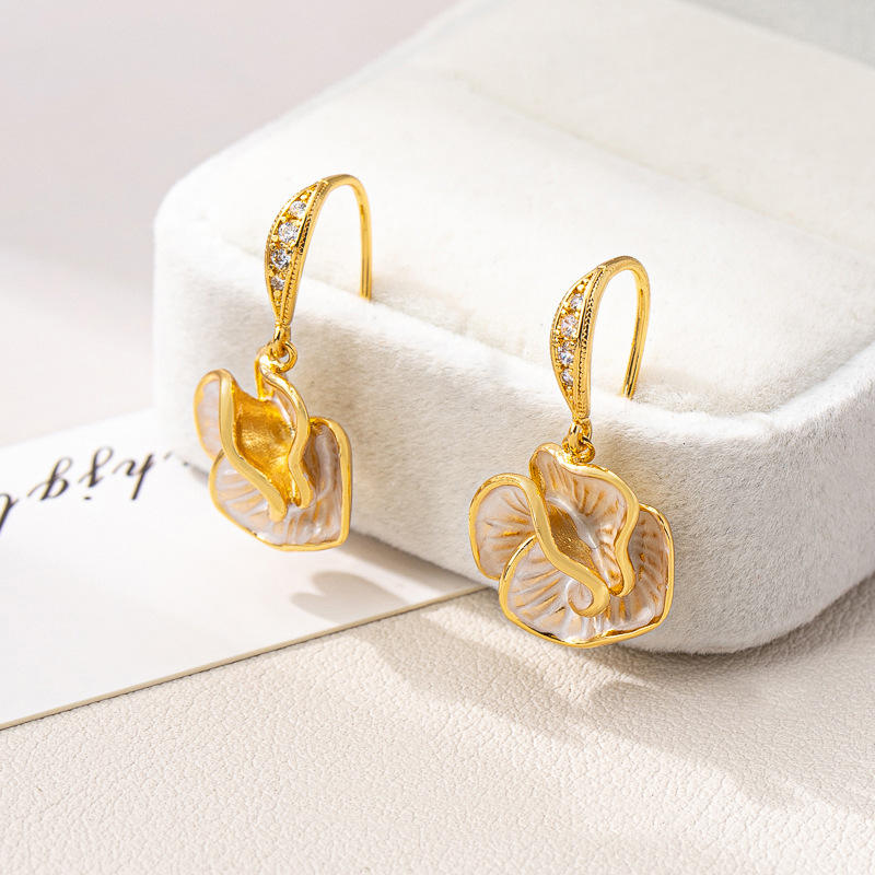 Pendientes de flor de Camelia esmaltados chapados en oro de 18 quilates de alta calidad con perla y circón