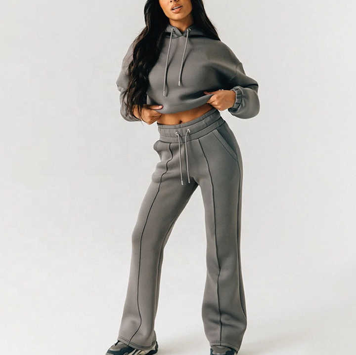 Conjunto de chándal de 2 piezas de alta calidad, conjunto de chándal, Sudadera corta de manga larga, trajes de Jogger acampanados de pierna ancha para mujer