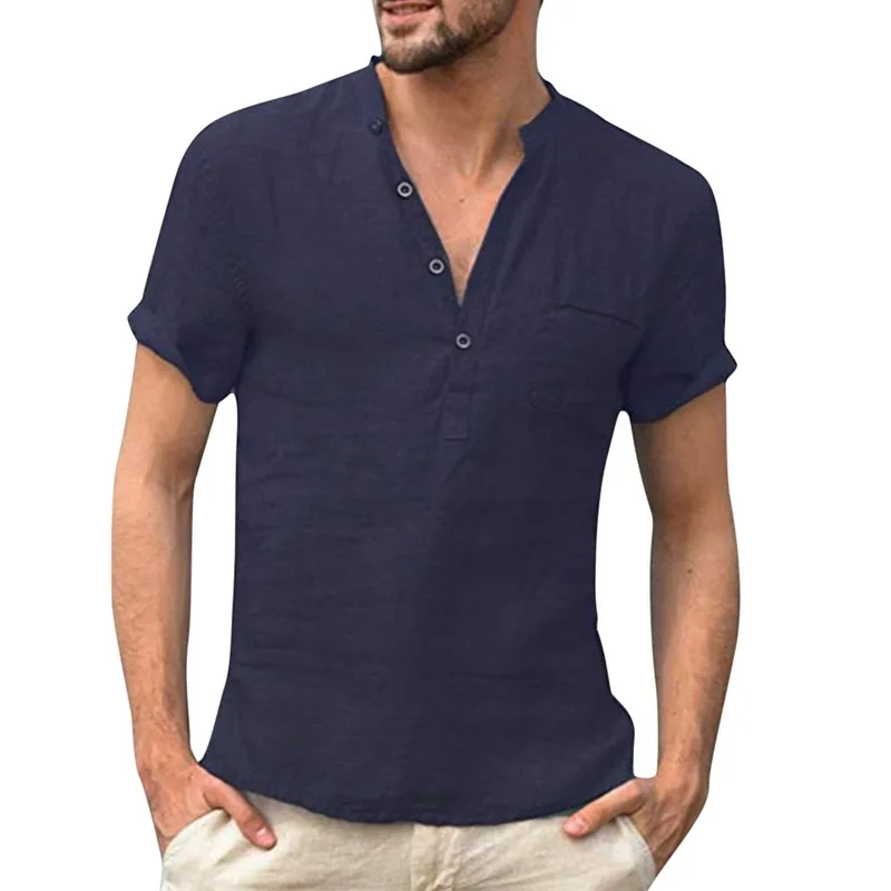 2023 camisetas de lino con cuello en V para hombre, camisetas de algodón de lino informales de alta calidad azul claro sólido, tallas