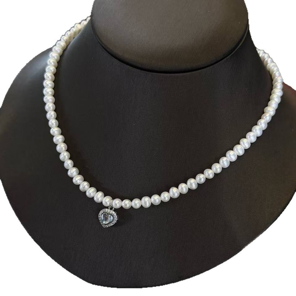 Collar de Perlas de Agua Dulce de Alta Calidad de 5-6 mm, Casi Redondas, con Pequeño Dije de Corazón, Elegante Adorno para el Cuello de Mujer