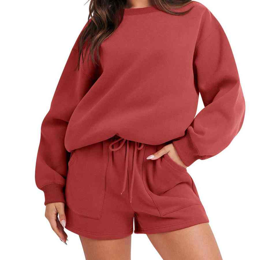 Alta calidad Otoño Invierno Color sólido tejido transpirable pulóver conjunto manga larga sudaderas pantalón corto Mujer Casual