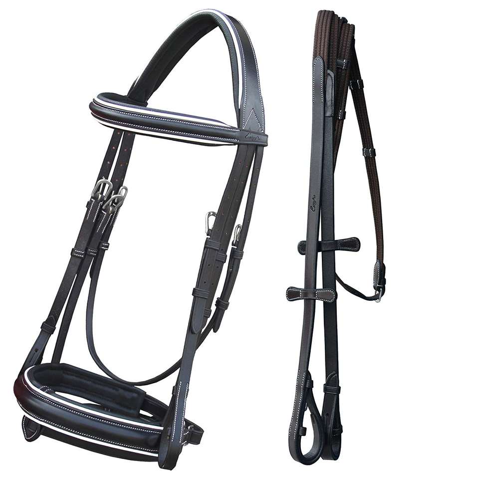 Brida ecuestre negra de alta calidad con rienda de cuero acolchada con tubería blanca para caballo de obstáculos equinos de tamaño completo