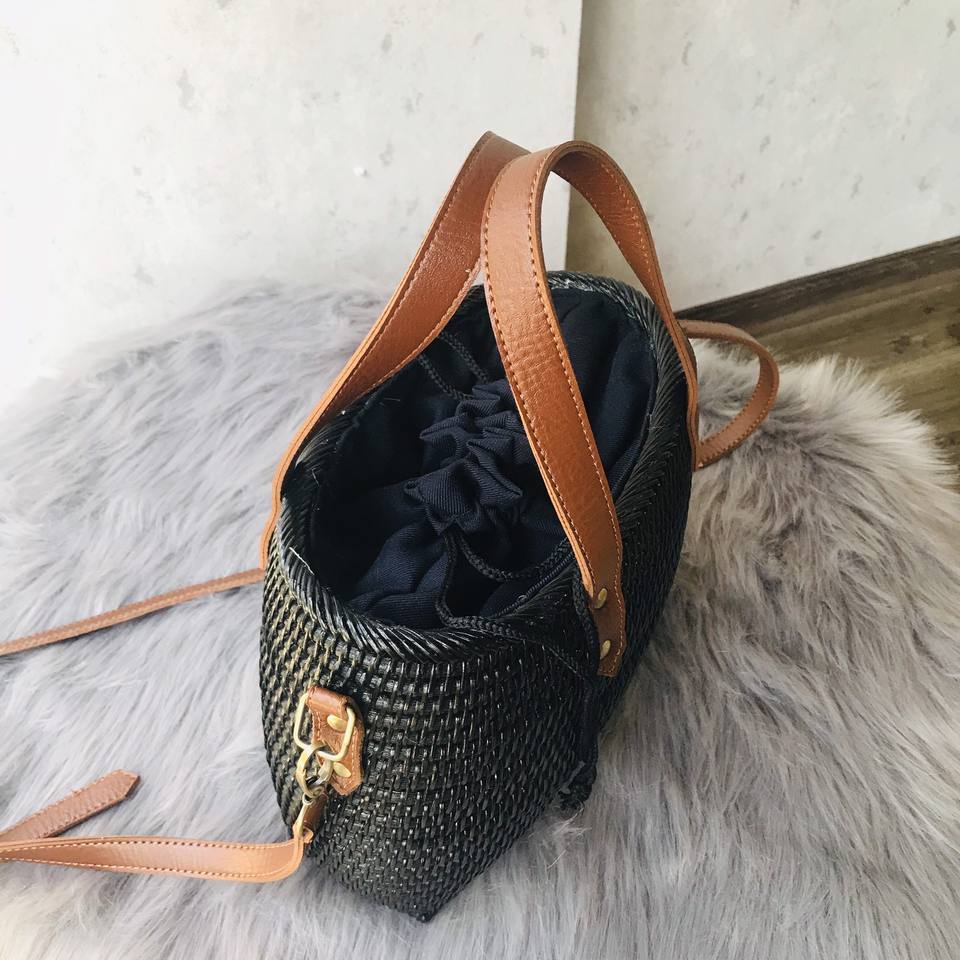Bolso de mimbre negro de alta calidad, con correa de cuero, de Vietnam