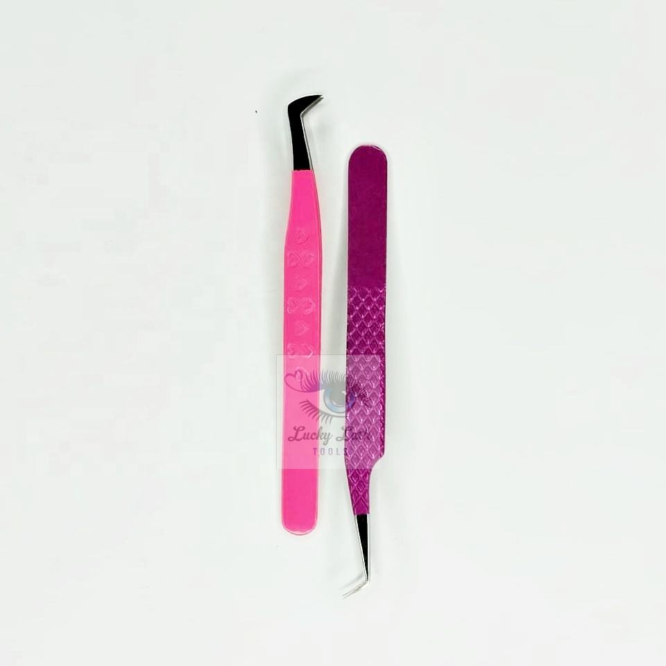 Bota de alta calidad, pinzas de extensión de pestañas de acero inoxidable con ángulo de 45 grados, 2 pinzas de pestañas con punta de fibra con estampado de corazón de diferentes colores