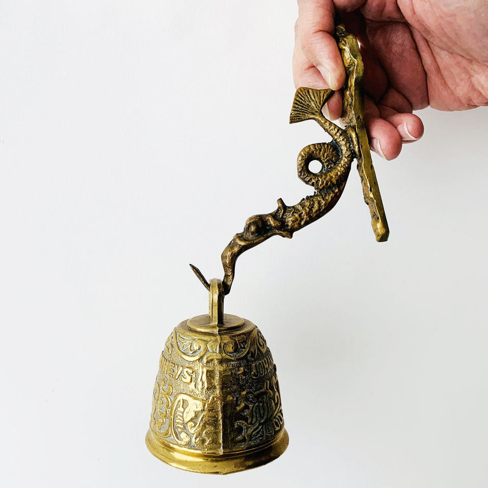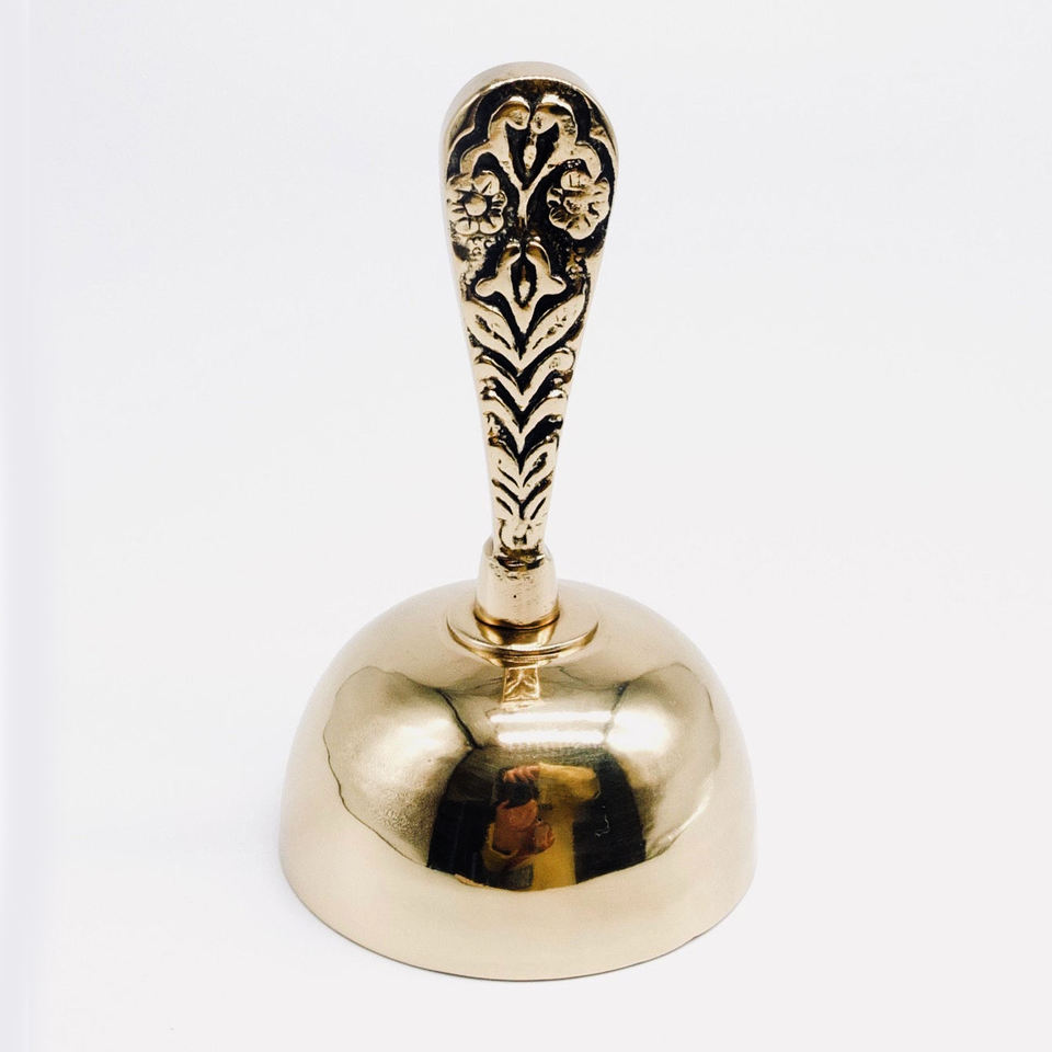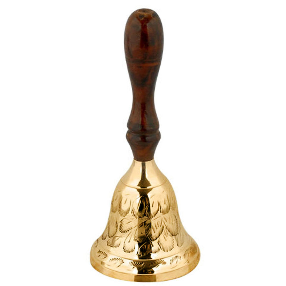 Campana de mano de latón de alta calidad para Navidad, campana con mango en relieve de alimentos usados de latón antiguo para servicio de llamadas de escritorio de oficina
