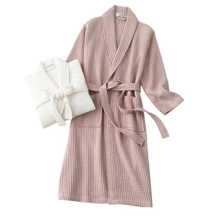 Ropa de dormir transpirable de algodón Waffle de alta calidad para primavera y verano para hoteles y bata larga logotipo personalizado ropa de Color sólido para mujer