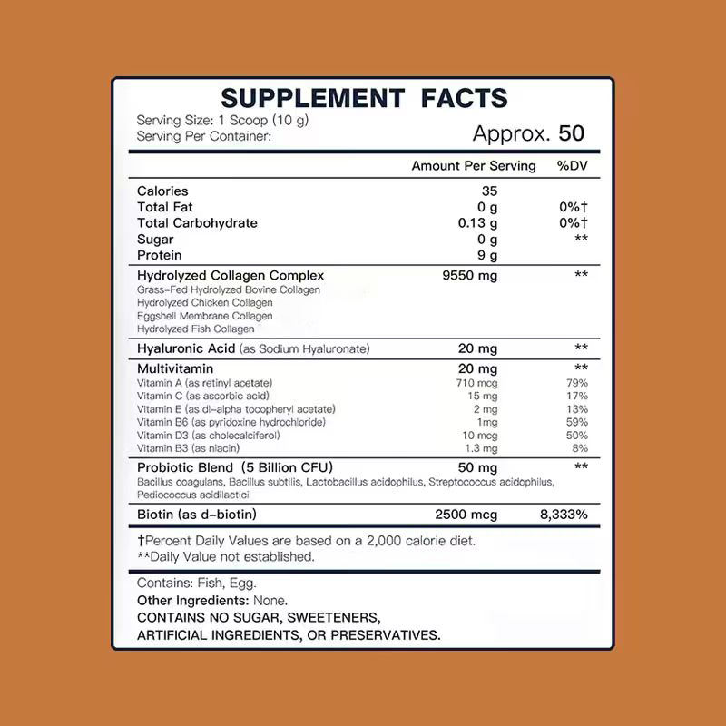 Hydrolyzed Collagen Complex, Hyaluronic Acid, Multivitamin, Probiotic Blend, Biotin