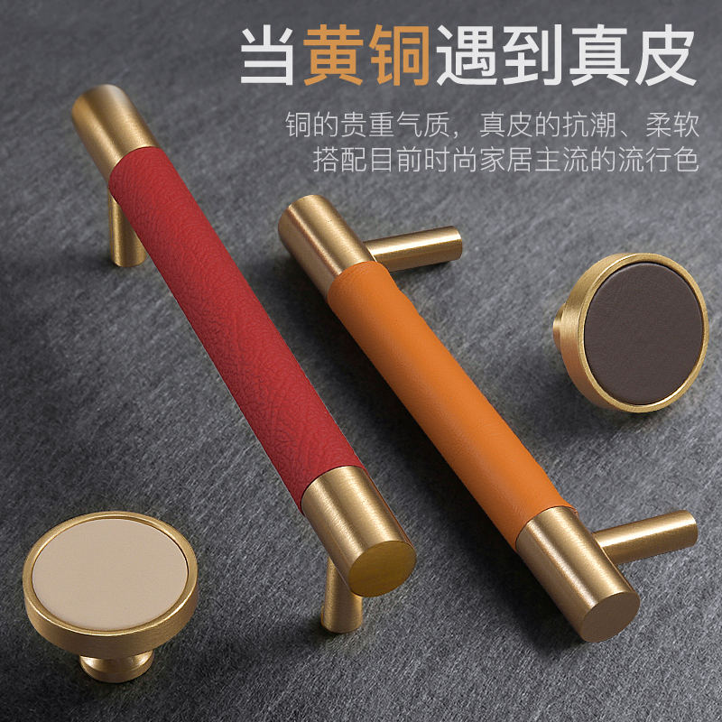 Tirador de cuero de cobre de alta calidad para armarios, tirador de puerta de cajón, tiradores de cobre y cuero