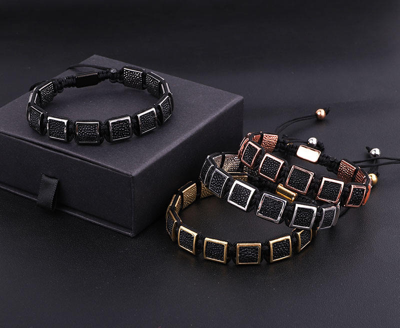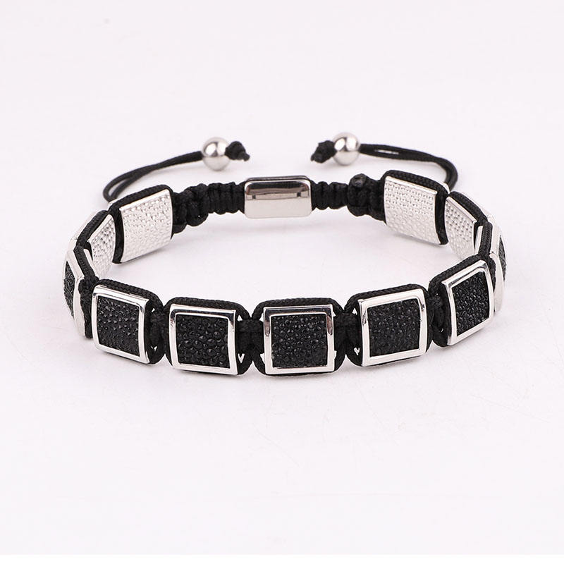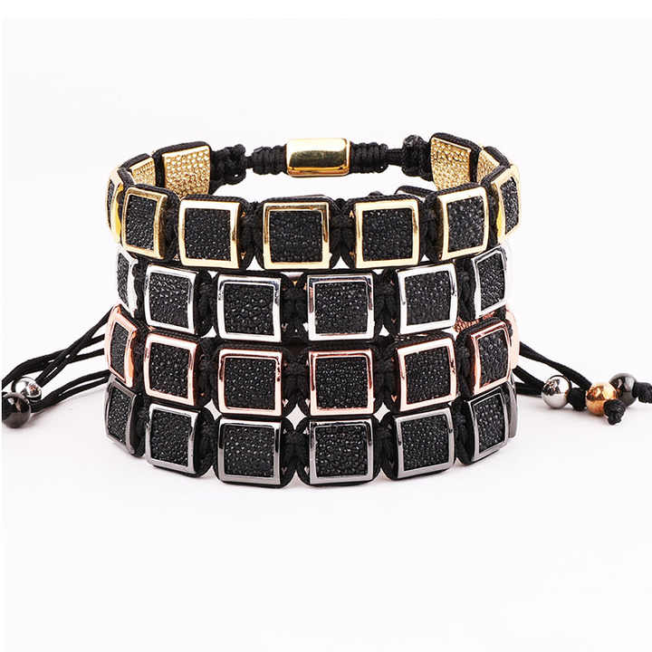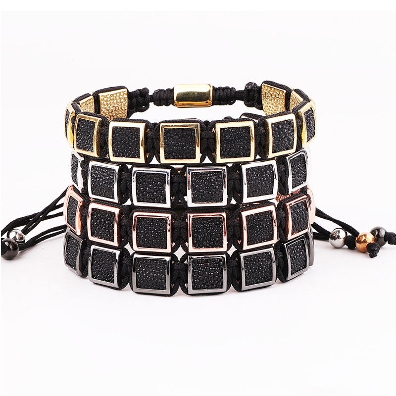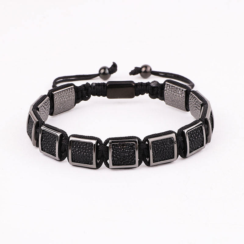 Pulsera ajustable para hombre de alta calidad, personalizada, cuero de piel de pez negro con cuentas cuadradas de latón trenzadas — pulsera de amistad