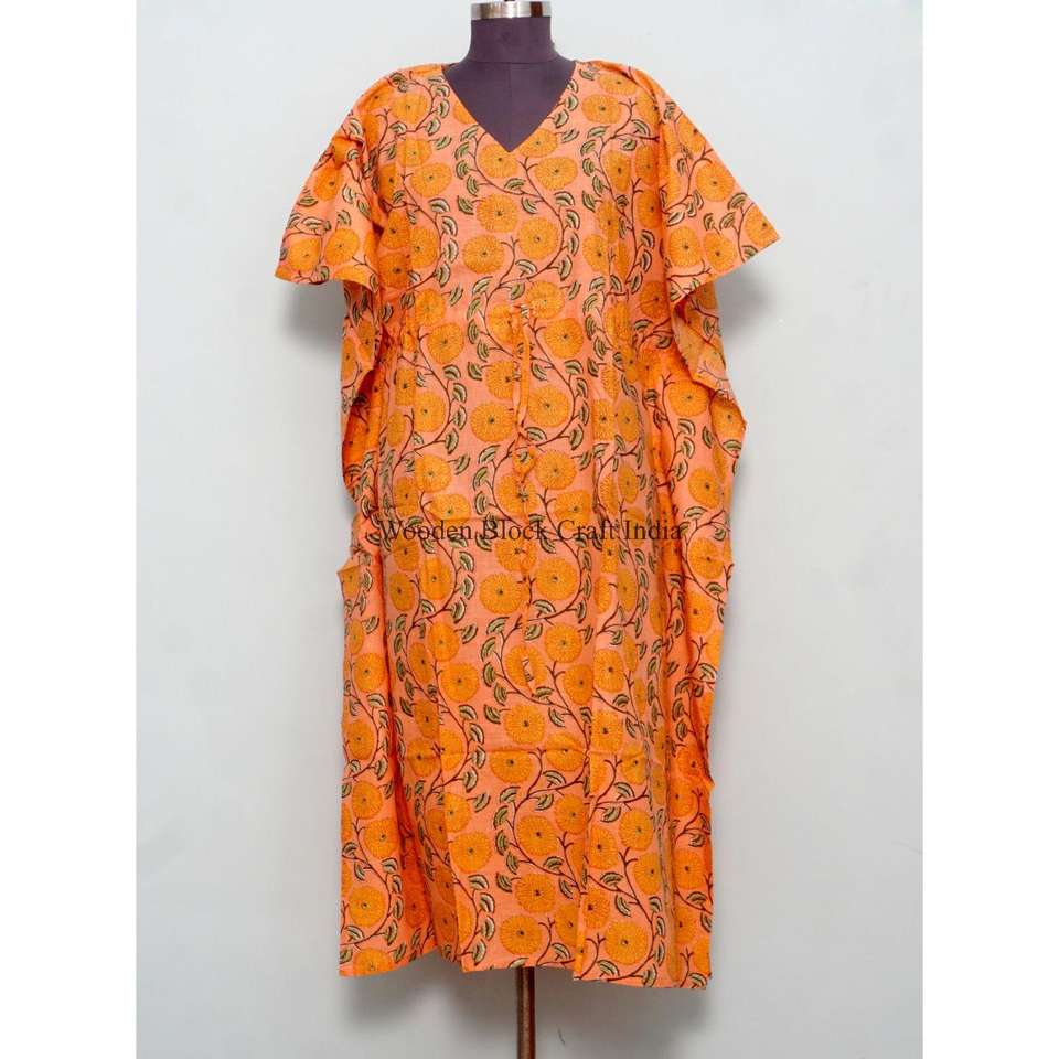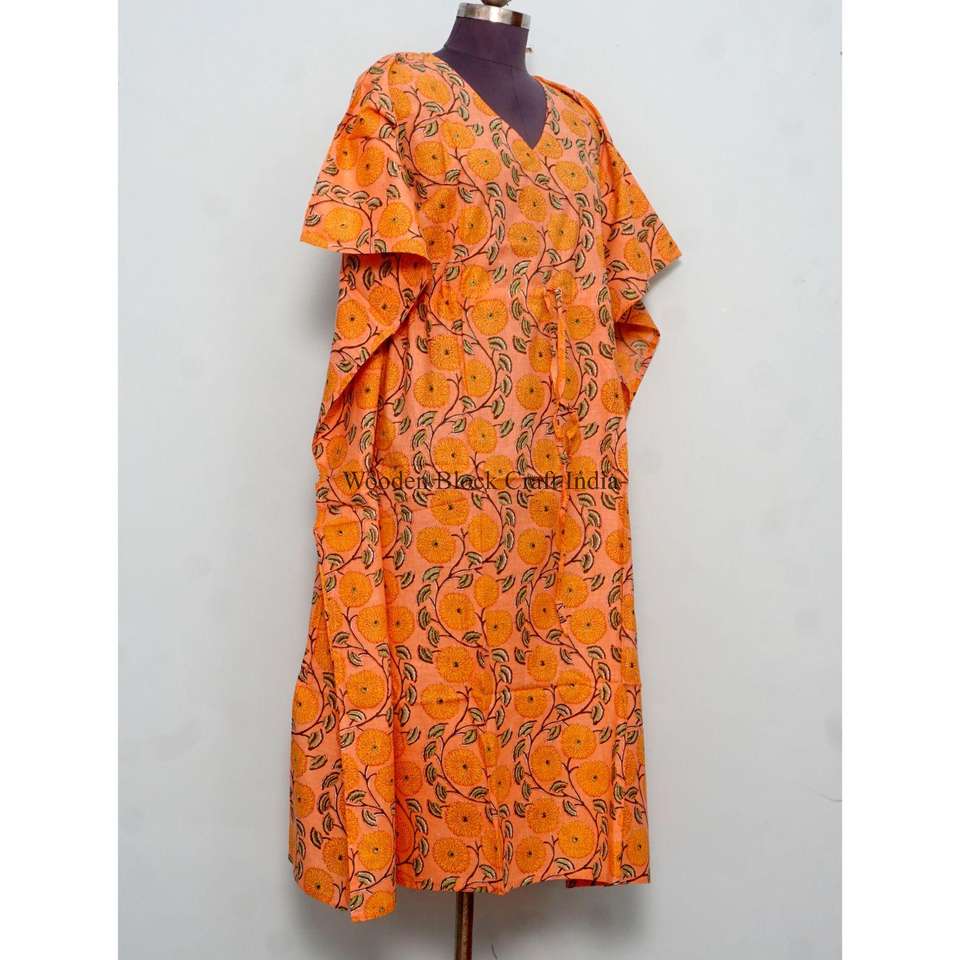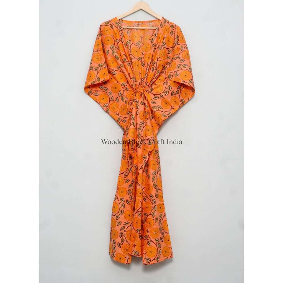 Vestido Kaftán de Tela con Estampado de Bloques Personalizado de Alta Calidad, Diseño con Cordón Ajustable en la Cintura, Corte Holgado, Largo, para Playa, Verano, para Mujer