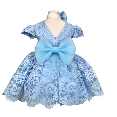 Alta calidad personalizado azul encaje niñas vestido cuello redondo manga corta Lux diseño moderno para primavera pequeñas fiestas cumpleaños al por mayor