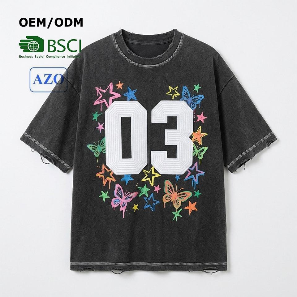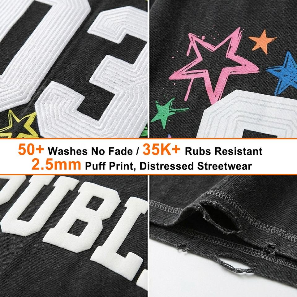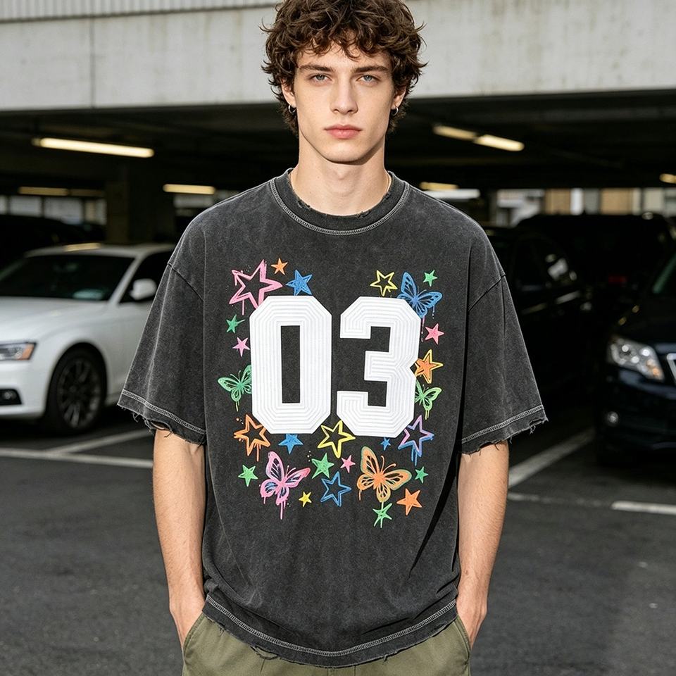 Camiseta de Hombre de Alta Calidad con Estampado Puff, Lavado Ácido, Costuras en Contraste, Bordado Plano y Diseño Dibujado a Mano, Estilo Desgastado y Holgado